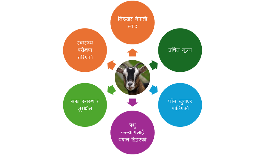 निर्भर छन् । गाउँमा उत्पादन भएको गुणस्तरीय खसीबोका बजारसम्म पुर्याउन र बजारमा बढ्दो स्वस्थ मासुको मागलाई पुरा गर्न वैज्ञानिक व्यवस्थापन, स्वस्थ उत्पादन र उचित बिक्री वितरण प्रणाली अनिवार्य हुन्छ । हाम्रो उद्देश्य गाउँघरका किसानहरुबाट उत्पादित गुणस्तरीय खसीबोकाको मासु उपभोक्तालाई उपलब्ध गराउनु रहेको छ।